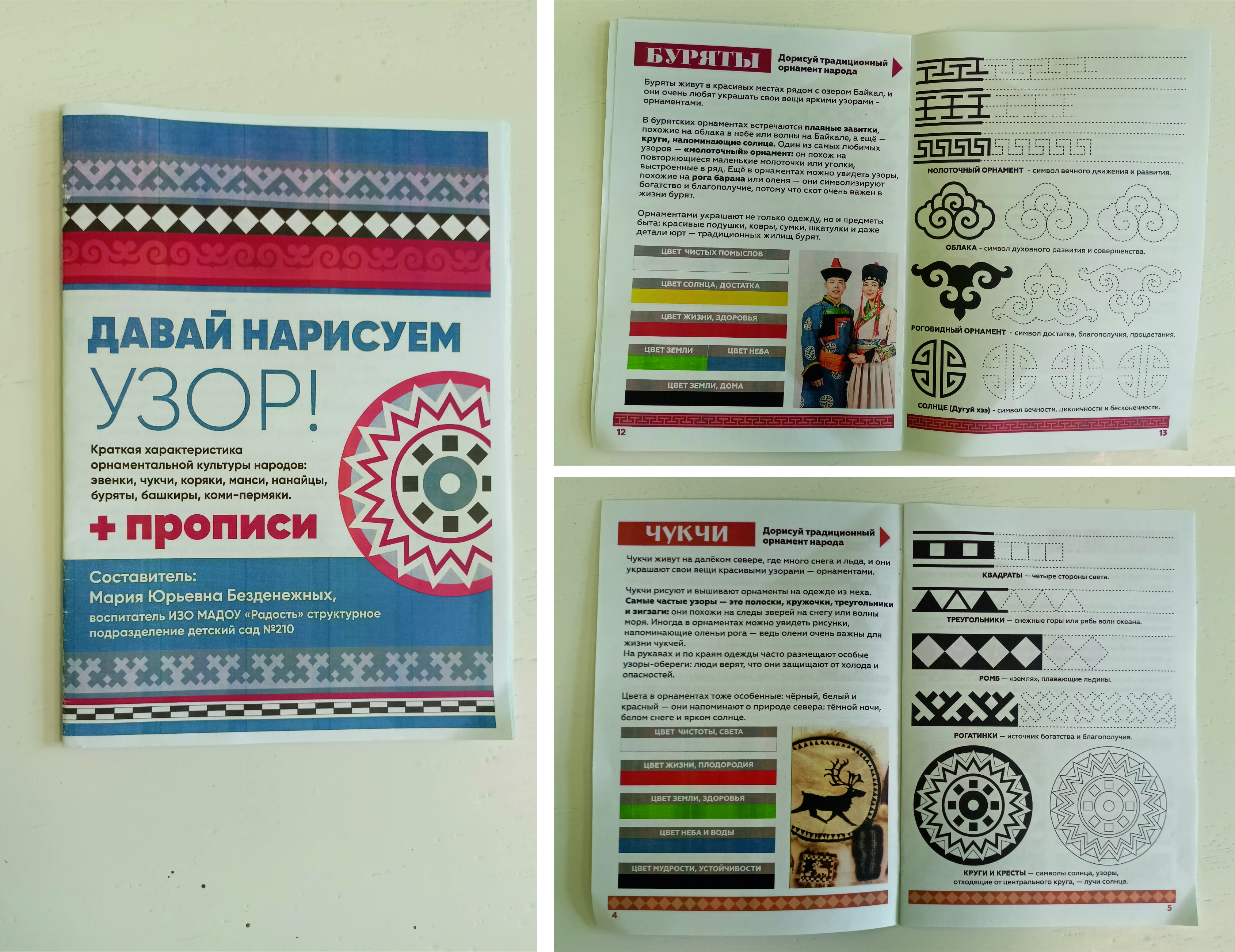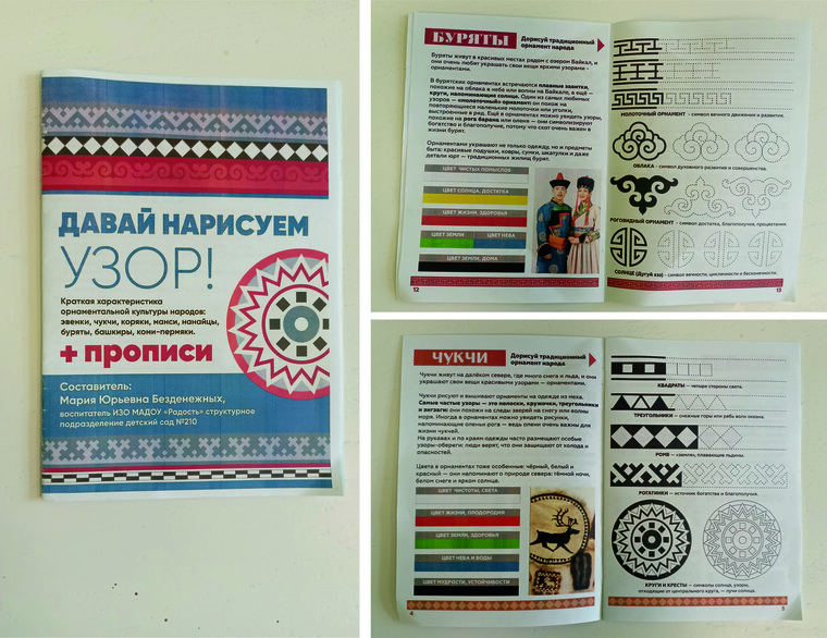 • Пособие «Давай нарисуем узор!». В нём собрана краткая характеристика орнаментальной культуры каждого народа, а также прописи для тренировки. Пособие используется в работе с новыми группами и стало частью методического фонда детского сада.