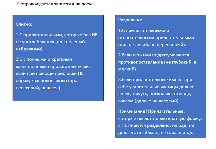 -А знаем ли мы, как будут писаться прилагательные с НЕ? (Ребята выдвигают свои предположения). Правильно, вы уже заметили, что возможно как слитное, так и раздельное написание. Может, кто-то уже заметил некоторое сходство с правилом НЕ с существительными? (Слитно, если без НЕ не употребляются. Раздельно, если есть противопоставление с союзом А).