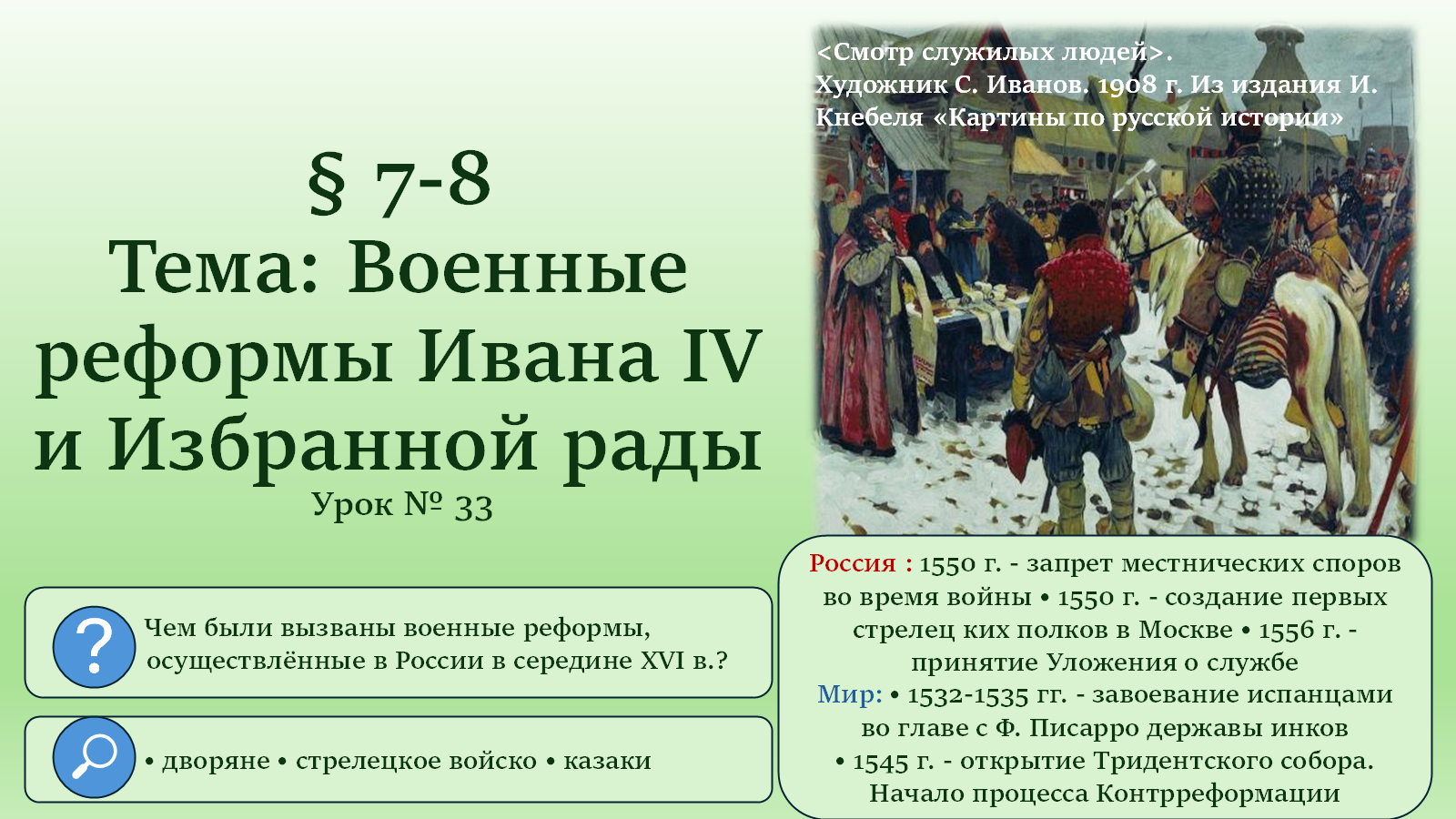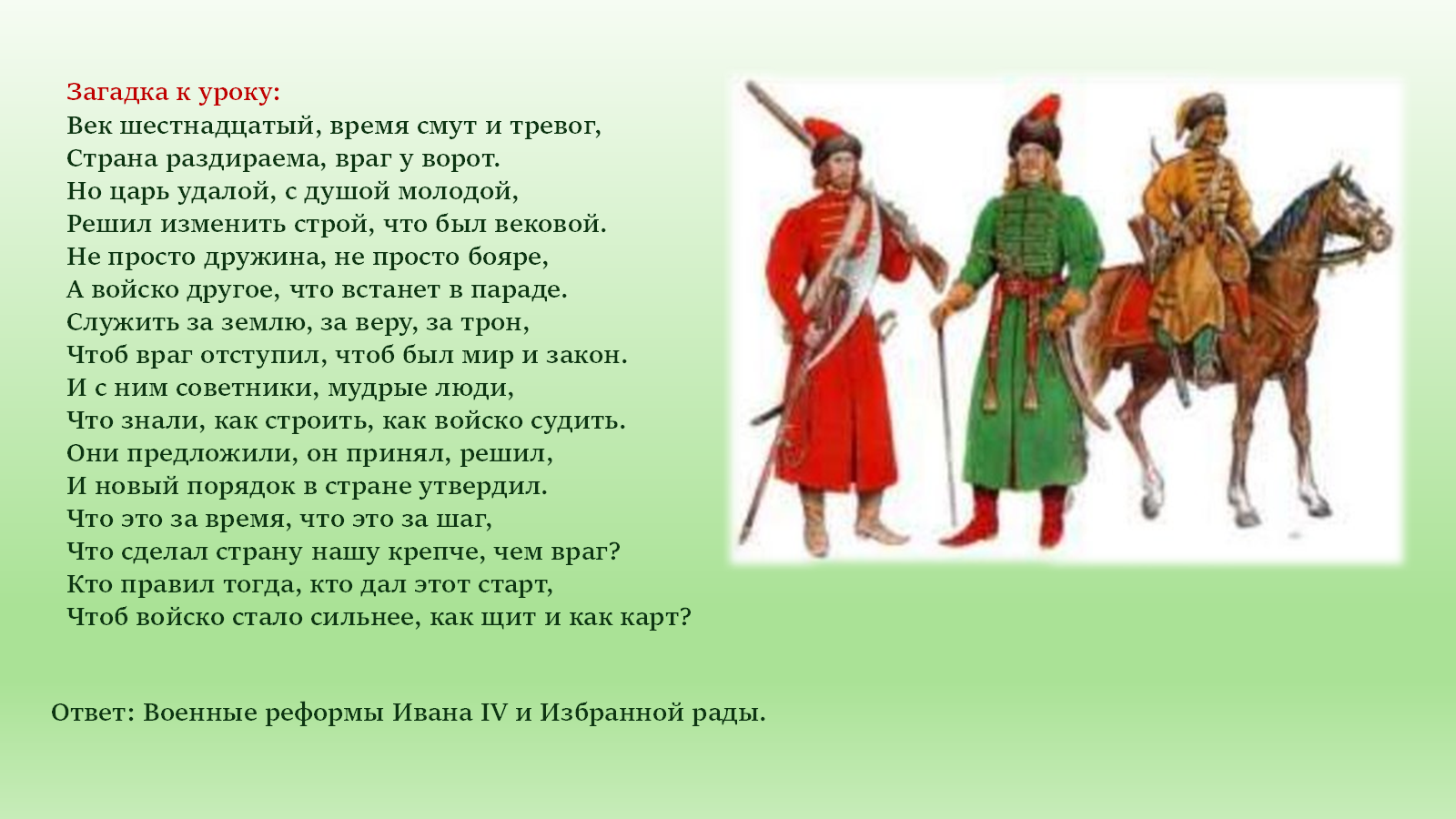 Период правления Ивана IV Грозного, особенно его ранние годы, ознаменовался значительными преобразованиями в военной сфере. Эти реформы, во многом инициированные и поддержанные кругом приближенных к царю людей, известным как Избранная рада, были направлены на укрепление центральной власти и повышение боеспособности русского войска.