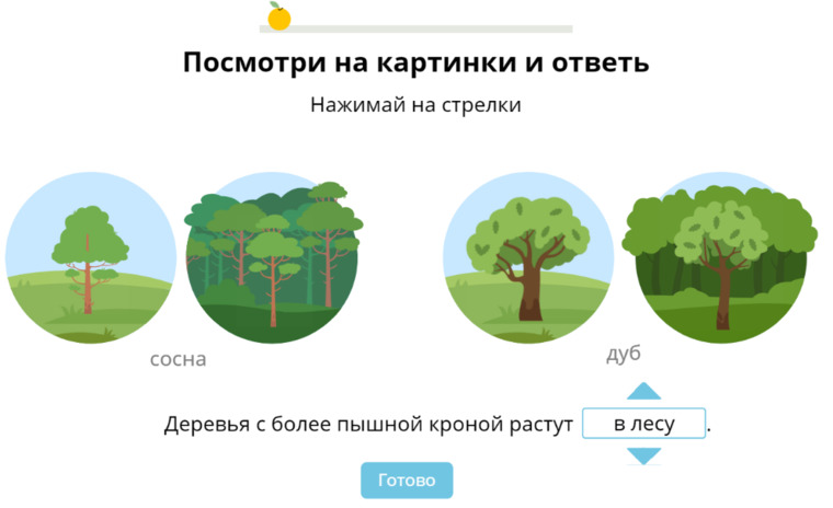 Ученикам предлагается сравнить растения леса и поляны. Дети, изучая иллюстрации деревьев, должны сравнить крону, и сделать вывод, деревья с пышной кроной растут где? В лесу или на поляне. Данный ЭОР развивает не только действие сравнение, но и анализ, умение делать выводы. Для того, чтобы правильно выполнить задание, нужно проанализировать, где находится сосна, какая у неё крона, и сделать вывод, что если крона не такая пышная, по сравнению с дубом, то она растёт в лесу. Тем самым ученик, произвёл анализ кроны сосны и дуба, сделать по этому вывод. Если ученик верно выполняет задание, он автоматически переходит к следующему заданию, если нет, то неверный ответ подсвечивается красным цветом, ученик делает вывод, что он не подходит и используют второй верный вариант ответа.