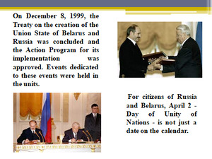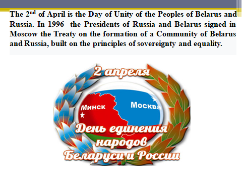 The 2nd of April is the Day of Unity of the Peoples of Belarus and Russia. In 1996 the Presidents of Russia and Belarus signed in Moscow the Treaty on the formation of a Community of Belarus and Russia, built on the principles of sovereignty and equality.