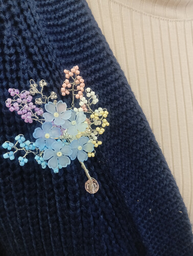 Комментарий: Брошь выполнена в технике плетения и скручивания с использованием бисера и бусин