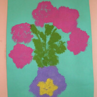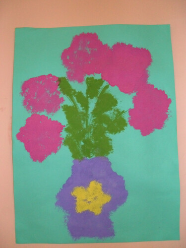 Комментарий: Изображение цветов выполнено густой гуашью методом тычка полусухой жесткой кистью. Рисунок предварительно сделан простым карандашом.