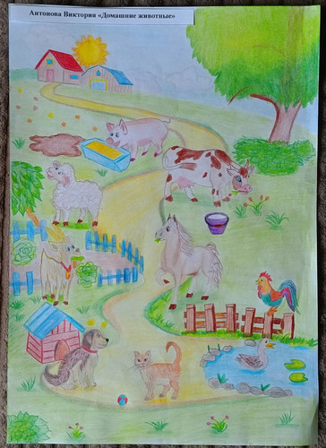 Комментарий: В рисунке изображены домашние животные, где отражается их пропитание и место проживание