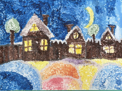 Комментарий: работа выполнена ватными палочками в технике пуантилизма