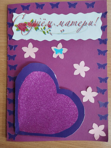 Комментарий: Из квадрата розовой бумаги делаем базовую форму двойной треугольник,затем вырезаем из него сердечко и приклеиваем на открытку.украшаем бабочками и цветочками,добавляем надпись С днём матери.