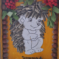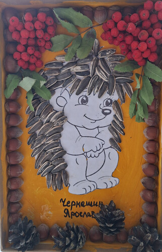 Комментарий: Для его создания этого симпатичного ежа использовали шишки, рябиновые ягоды, семечки подсолнечника и лесные орехи.