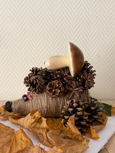 Комментарий: Для её изготовления использовали такие природные материалы, как сосновые шишки, осенние листья, веревка, ягодки калины. При помощи пластилина вылепили носик и глазки. Автор поделки придумал, что ёжик несёт на иголках грибок, потому что осень, и ему нужны запасы.