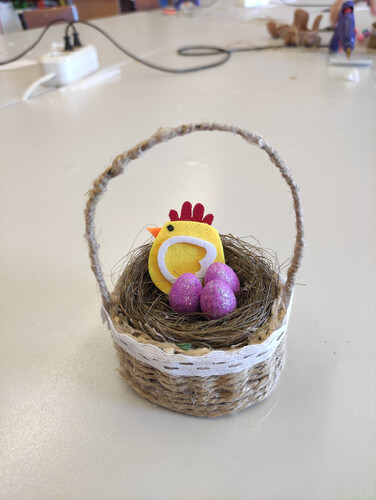 Комментарий: Сувенир. Для работы использовались материалы: спил дерева, палочки для шашлыка, сизаль, джут, фигурные яйца и цыпленок.