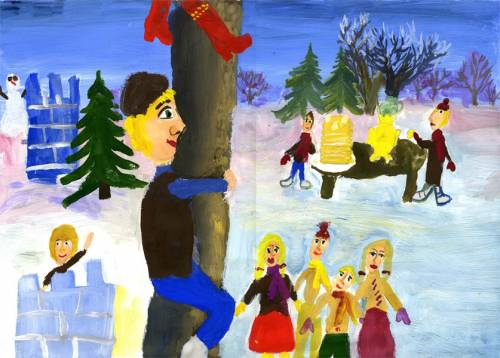 Комментарий: Сначала я продумала композицию и нарисовала несколько эскизов. Нарисовала мальчика, который лезет за красными сапогами. Это масленичная традиция. Рядом я нарисовала толпу, которая смотрит на него. На заднем плане праздничный стол с самоваром и стопкой солнечных блинов. Слева от мальчика две снежные крепости, это традиционная сибирская масленичная забава — взятие снежной крепости. Я попыталась передать настроение праздника, народных игр и забав. В рисунке я использовала разные цвета и оттенки, больше всего мне понравился загадочный цвет блеклого тумана. Для людей я использовала яркие краски. Масленица — это яркий и красивый праздник!