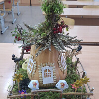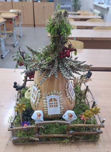 Комментарий: Работа выполнена из даров осени ( тыква, семена тыквы, патиссон, ягоды рябины, паслена) и природных материалов ( веточки, мох, крылатки клена, шишки сосны)