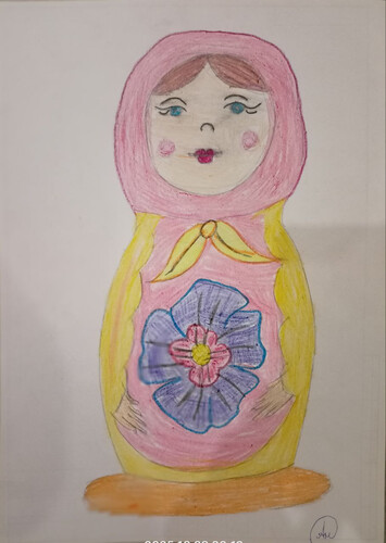 Комментарий: Классическая русская матрёшка изображенная в желтом сарафане и красном платке, фартуке с цветочным узором. У неё округлая форма, доброе лицо с румянцем на щеках и небольшая, едва заметная улыбка