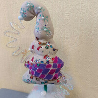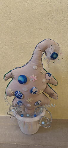 Комментарий: Елка сшита из ткани рогожка, далее расписана красками по ткани, декрирована бусинами