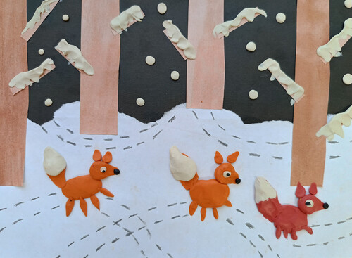 Комментарий: Комбинированная аппликация. Использованные материалы: картон, бумага, пластилин.