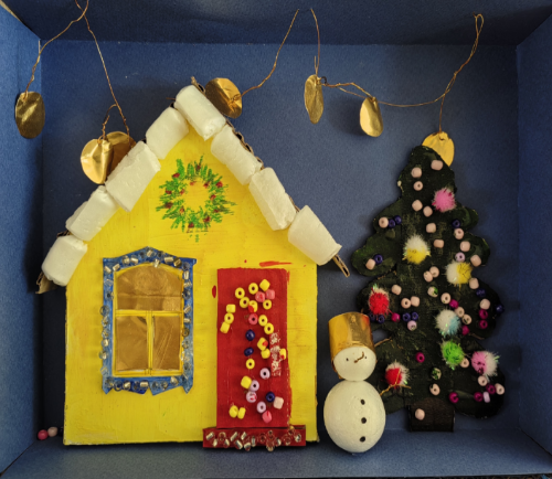 Комментарий: Основа - коробка, которая внутри обклеена цветной бумагой синего цвета. В центре композиции расположен картонный домик, покрашенный жёлтой краской. Крышу дома обрамляют кусочки пенопласта - имитация снега. Ниже нарисован красками "Рождественский венок". У дома есть окно, которое нарисовано простым карандашом, а потом раскрашено красками, "наличники" раскрашены краской синего цвета и украшены бисером (приклеен на клей). Дверь нарисована карандашом, а после покрашена красной краской, есть имитация "ручки". Задекорировано бисером приклеенным на клей и немного краски белого цвета (эффект снега). Внизу имеется маленькой крылечко раскрашено в цвет двери и украшено бисером. Рядом находится снеговик из пенопластовых шариков. Глаза и пуговки нарисованы чёрной краской. Нос из проволоки. "Ведро" на голове у снеговика из картона. Ёлка из картона, покрашена в зелёный цвет и украшена бисером, помпоны для творчества. Сверху композиции прикреплена проволока, на