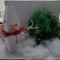 Комментарий: Сначала мы покрасили лист в голубой цвет. Вырезали домики из картона и покрасили их коричневой краской, потом приклеили на лист. Вырезали ёлочки, чтобы они были объемными, мы вырезали ещё раз каждый ярус отдельно и сделали бахрому, как будто иголки. Березы вырезали из такого же картона как и домики, только не убирали верхний слой, а сразу покрасили белой краской. Облака и снеговика мы сделали из салфеток: соединили несколько салфеток вырезали круг и сделали бахрому,как на елочках, а потом распушили. Потом решили, что не хватает снега. И из салфеток сделали снег: отрывали кусочки салфеток и приклеивали. Украсили снегом из салфеток крыши домов, на ёлочки приклеили.