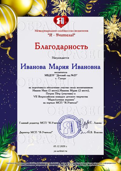 Благодарственное письмо куратору - 100 рублей за каждый электронный документ. Куратор у одной работы может быть только один и только у детских работ! Если по каким-то причинам Вы пишите несколько кураторов, в документах будет отображено только имя первого указанного куратора! Будьте внимательны!