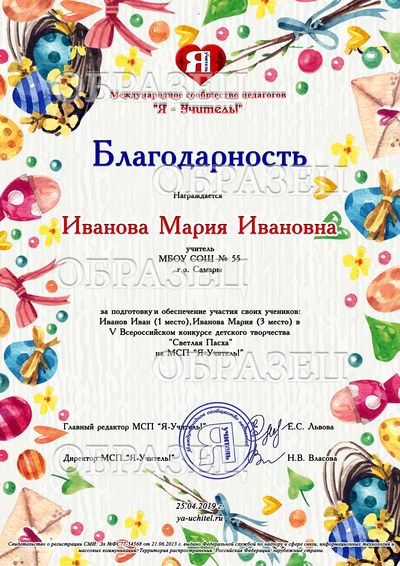 Благодарственное письмо куратору - 100 рублей за каждый электронный документ. Куратор у одной работы может быть только один и только у детских работ! Если по каким-то причинам Вы пишите несколько кураторов, в документах будет отображено только имя первого указанного куратора! Будьте внимательны!
