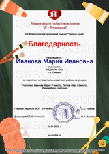 Благодарственное письмо куратору - 100 рублей за каждый электронный документ. Куратор у одной работы может быть только один и только у детских работ! Если по каким-то причинам Вы пишите несколько кураторов, в документах будет отображено только имя первого указанного куратора! Будьте внимательны!