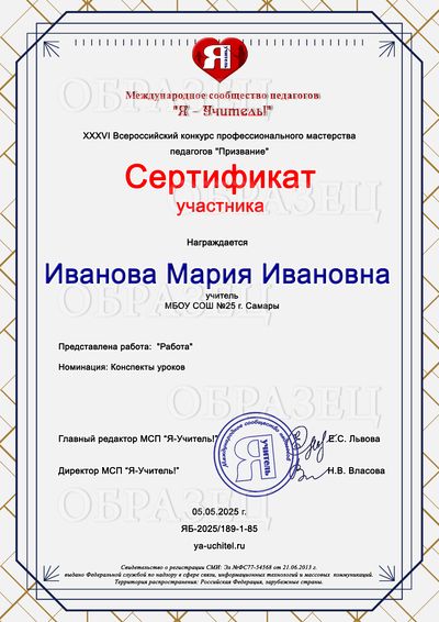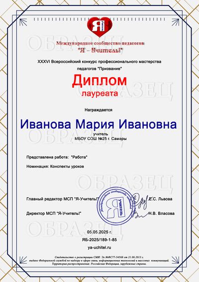 6. Администрация сайта оставляет за собой право использовать работы как в коммерческих, так и некоммерческих целях, публиковать их на сайте https://ya-uchitel.ru/ и привязанных к сайту соцсетях, журналах, сборниках с обязательным указанием Вашего авторства.
