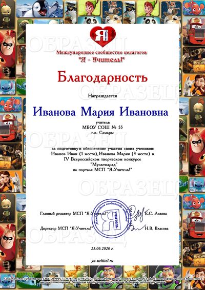 Благодарственное письмо куратору - 100 рублей за каждый электронный документ. Куратор у одной работы может быть только один и только у детских работ! Если по каким-то причинам Вы пишите несколько кураторов, в документах будет отображено только имя первого указанного куратора! Будьте внимательны!
